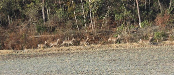 今朝道端の桃園で作業中、鹿がたくさんいると通行中の人が車を停めて教えてくださいました。早速桃園の端っこの田へ行ってみると、いました、いました。それも6頭。カメラを持って近くへ行くまで逃げません。近年すごく殖えました。孫はじいちゃんのサファリだと言っています。先日は日中猪が車の前へ2頭現れてびっくりしましたからまさに動物園のようになっています。猪の垣はしていますが、鹿となると猪の1mのメッシュの垣は軽々飛び越えます。