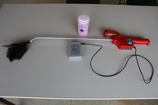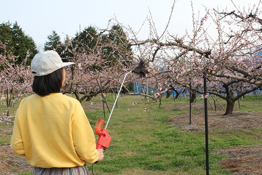 桃の花が2~3分咲きになってきました。 新潟の星野(株)から電子制御花粉交配器 花愛子75 をお借りしました。花粉を石松子で希釈して機械に装着し使用します。動力はバッテリーです、1回の充電で8時間使用可能だそうです。花粉を先端の毛バタキに噴射して毛バタキに付着した花粉を花になぞります。その毛バタキの毛が「ダチョウ」なのだそうです。思ったよりしなやかで梵天よりは随分楽です。場所を決めて2回やって結実具合をみます。明日は4~5分咲きになり。本格的な授粉ができそうで幸い最高気温が23度になるとか。積算温度が100度は必要ですから絶好の日になりそうです。
