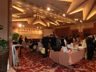 天府四川・日本行 「天府の国」四川・日本の旅と銘打った四川省農業展示プロモーション会が広島市南区元宇品のグランドプリンスホテル広島で開催されました。広島県と四川省は1984年に友好提携して以来、商工業、農林業、環境、医療、教育、文化など幅広い分野で交流してきました。特に農業研修生は185名に及び四川省の各地で農業やその指導の核となって活躍されつつあります。私の農園でも研修生を受け入れたことがあり、もう20年来お付き合いしている方がいます。今回はその知人が事務局として企画したので微力ながら協力しました。本日はそれで、開会式と午宴にご招待をいただきました。26年前に私の農園へ来たことがある人など昔話に花が咲きました。乾杯のお酒は四川省を代表する五粮液(ごりょうえき)52度のアルコールは効きました。 四川省の副省長、農業庁長、副庁長などそうそうたる方々の来広でした。