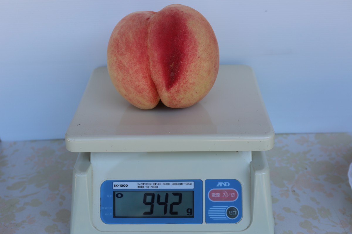 丁度11年前に1050gの阿部白桃を収穫したのが同じ9月9日でした。それから900g台は毎年数個収穫しますが1kgを超える桃はお目にかかれません。本日の942gは阿部白桃としては大きい方に入ります。両手で拝むようにして採りました。ずっしりとした重さ、すぐに秤へ向かいました。
